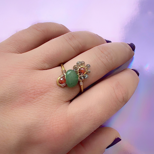 La bague Azélie est une création délicate façonnée entièrement à la main. Elle naît d'un fil de laiton de 1,5 mm, hypoallergénique, patiemment travaillé pour former une fleur lumineuse en pierres fines naturelle soigneusement choisies.