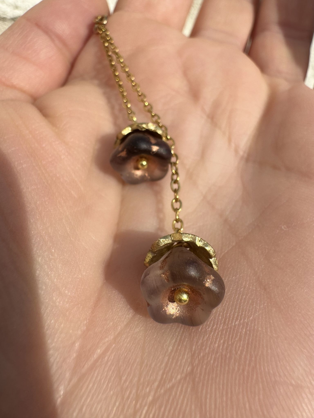 Suspendues à une chaine en acier inoxydable, les fleurs en verres pressé, coiffées de leur petit chapeau en laiton brut texturé, captent la lumière avec subtilité et accompagnent chaque mouvement avec grâce.