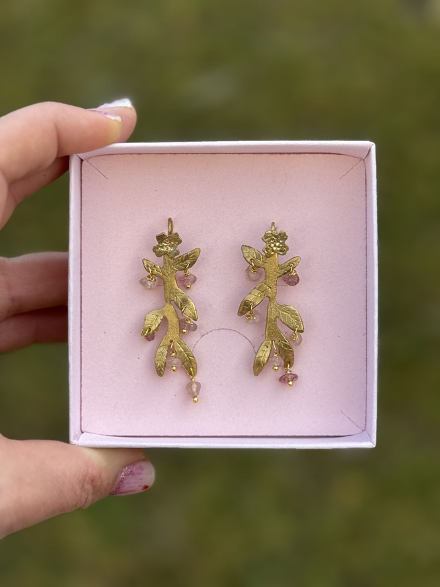 Viennent naître au bout des feuilles, de petites pierres de Quartz Strawberry, aux nuances rosés, qui évoquent de minuscules fleurs en bouton. Le Quartz Strawberry diffuse une énergie douce et réconfortante. Mobiles, elles accompagnent chaque mouvement et apporte de la vie au bijou.