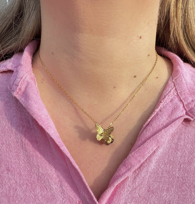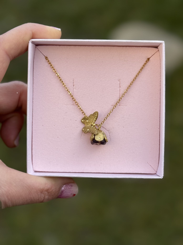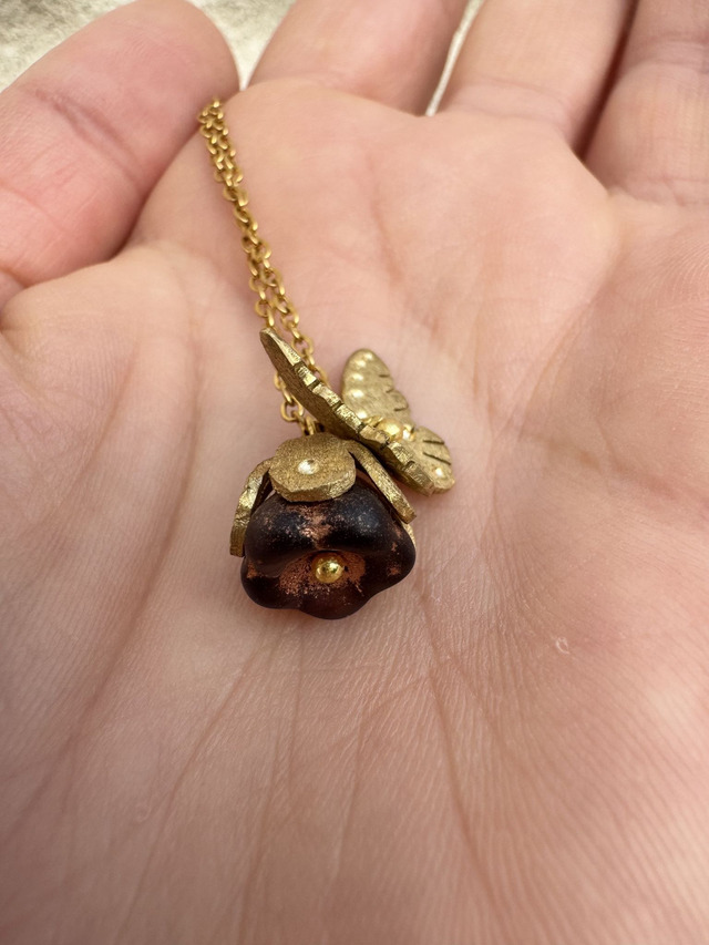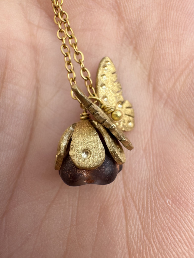 Au creux d'une chaine en acier inoxydable (conforme à la réglementation REACH), il met en lumière une fleur en verre pressé, coiffée de son petit chapeau en laiton brut. Un papillon en laiton brut, finement travaillé, vient se poser sur la fleur, évoquant un instant fragile et poétique, un souffle de vie capturé. L'association du verre, du laiton crée une harmonie douce et lumineuse. Garanti sans nickel, sans plomb ni cadmium, ce collier allie beauté, confort et durabilité.
